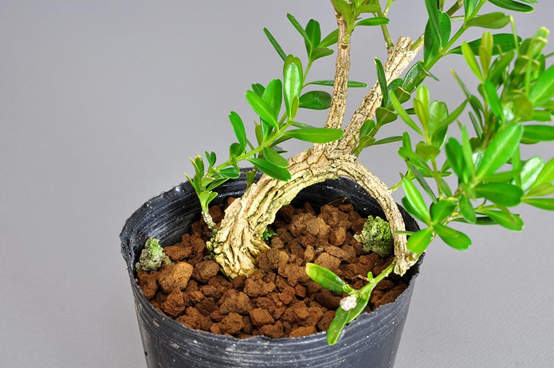 台湾ツゲの挿し木で5年のミニ盆栽用の素材です。彫りの深い荒れ肌は素晴らしい見応えがあります。小枝も作り安そうなので小さな盆栽や豆盆栽にも向いていそうです。