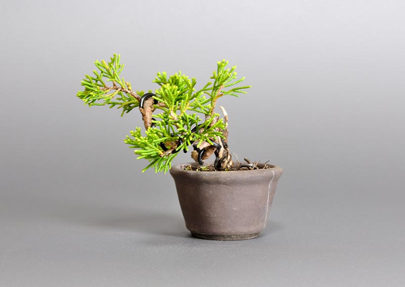 仕立て中のシンパクの豆盆栽です。型鉢にはひび割れがあります。